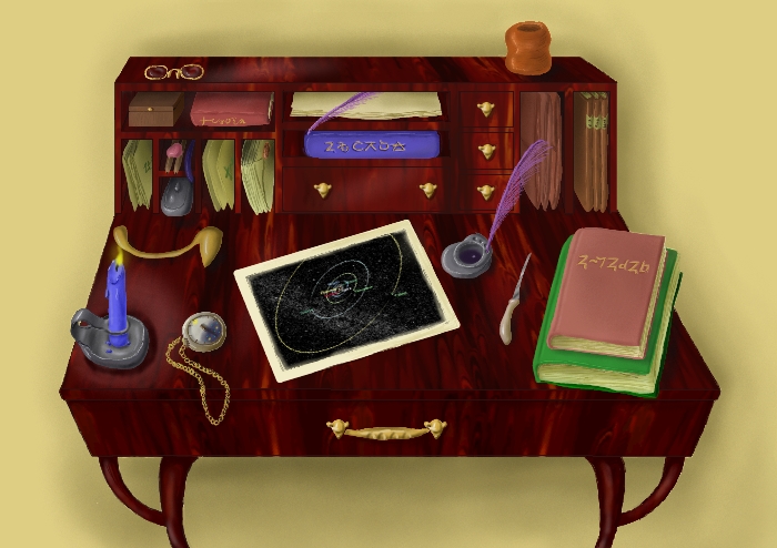 In the center of the desk is a representation of the solar system. Almeans were far ahead of terrestrials in understanding that their planet moves around their sun; the idea was proposed by Cuzeian scholars, and widely accepted in ancient times. It was only in the last centuries, however, that the planetary orbits were understood to be ellipses.