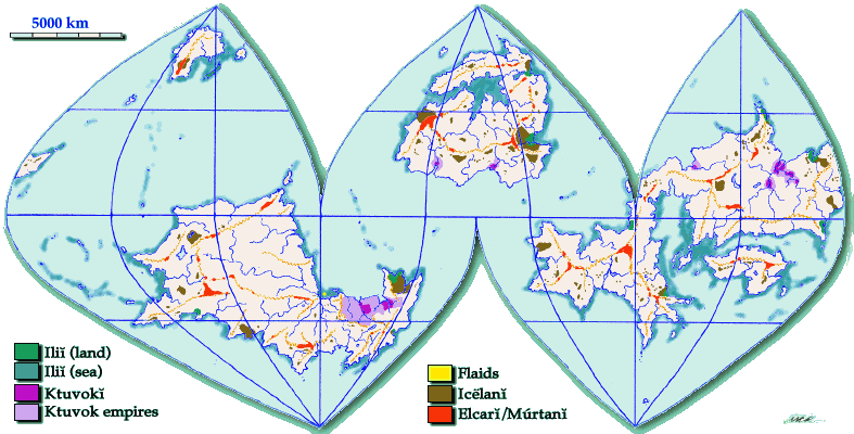 It is also to be noted that ktuvoks empires are always geared to the technological level of the surrounding hominids and lutinids. In the ancient wars with the ilii, unimaginably large armies of hominids were deployed by the ktuvoks. Only in Ereláe is there to be found an empire of the size and power of Dhekhnam (but the swamps of Ereláe are also the largest ktuvok habitats). The ktuvok kingdoms of Lebiscuri, where the hominids are at a hunter-gatherer level of production, are relatively modest in size, and at only a neolithic level.